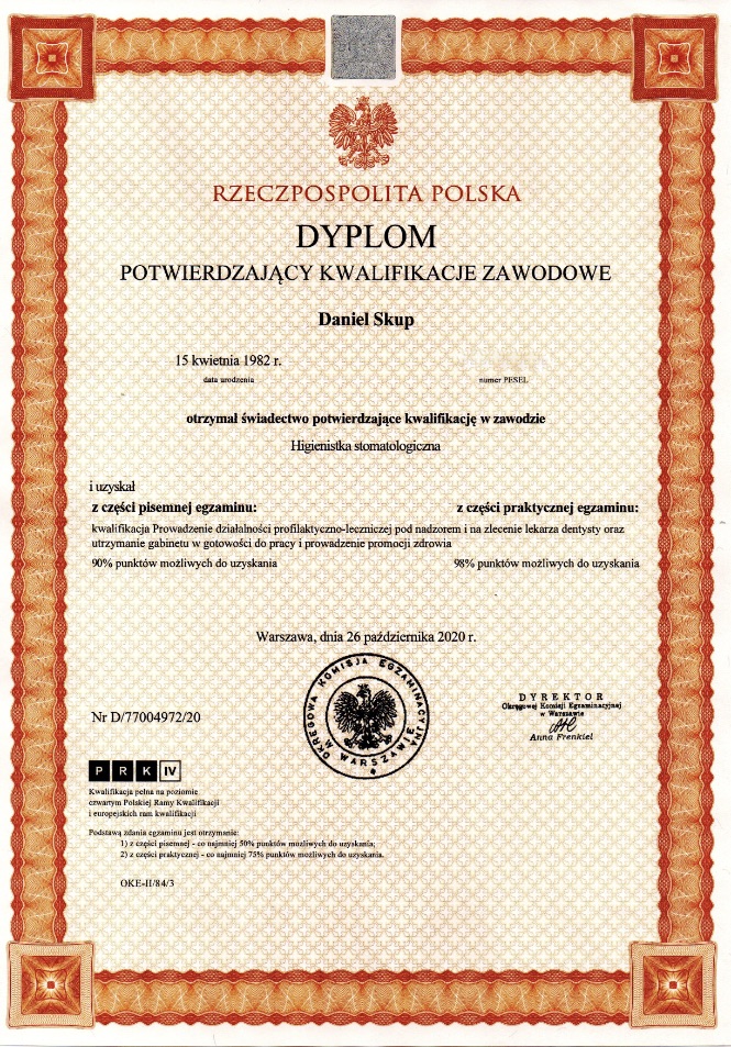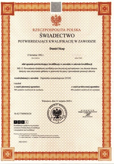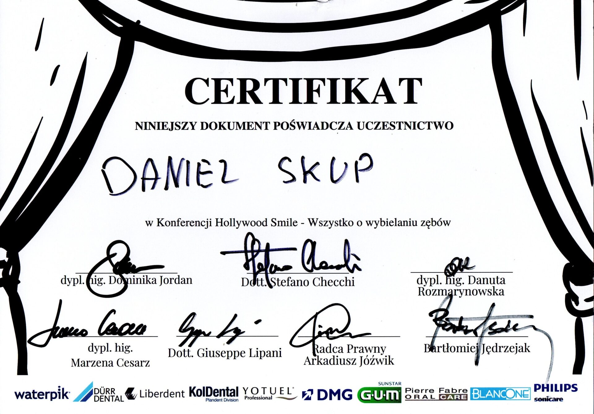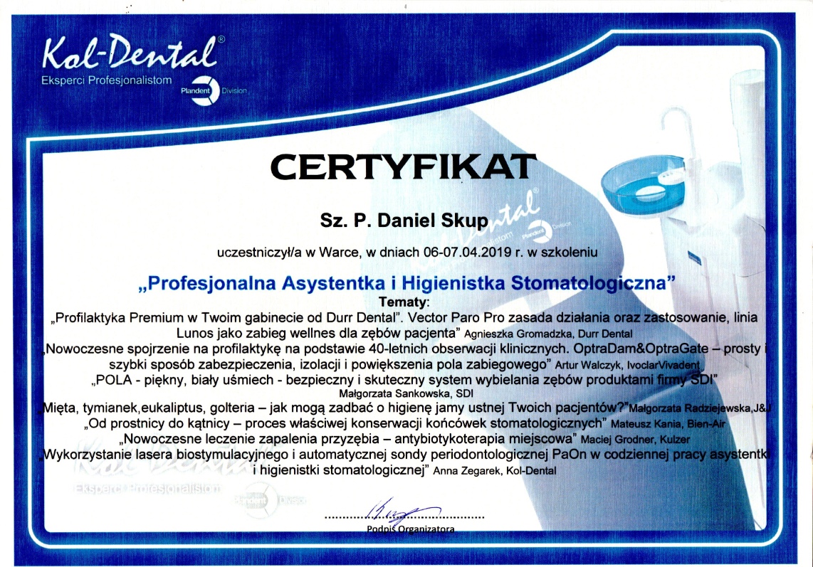 Daniel Skup związany jest z gabinetem Smile-Dent od 2017 r, który specjalizuje się w zabiegach higienizacyjnych i profilaktycznych oraz wybielaniu zębów. W roku 2020 ukończył Policealną Szkołę Nova w Warszawie i uzyskał dyplom potwierdzający kwalifikacje zawodowe jako higienista stomatologiczny. W gabinecie ponadto asystuje przy stomatologii zachowawczej, ortodoncji, chirurgii, protetyce. Stawia na stałe podnoszenie kwalifikacji, odbywa szkolenia medyczne. Wyróżnia Go wysoka kultura osobista i łatwość w nawiązywaniu pozytywnych relacji z pacjentami.