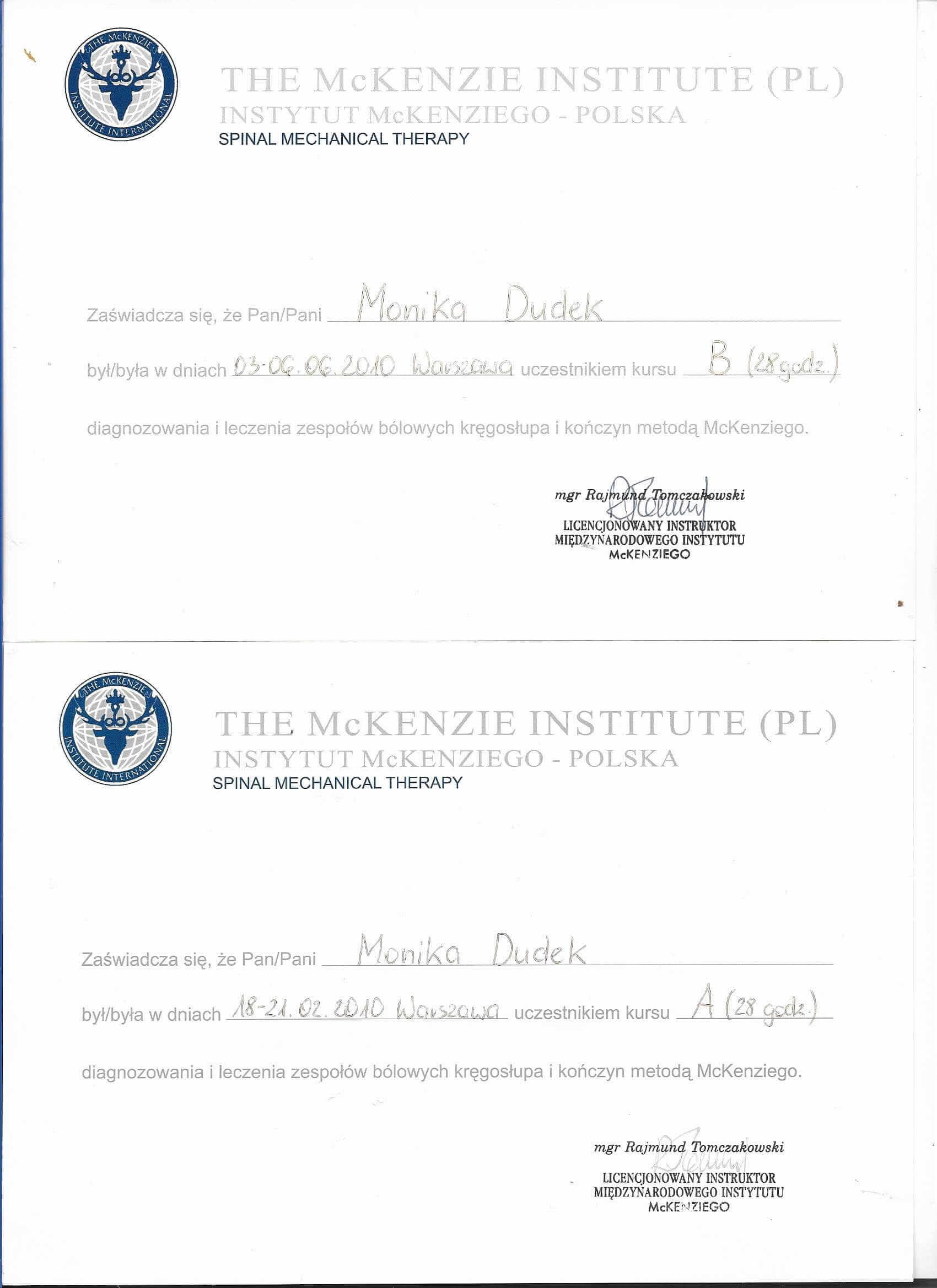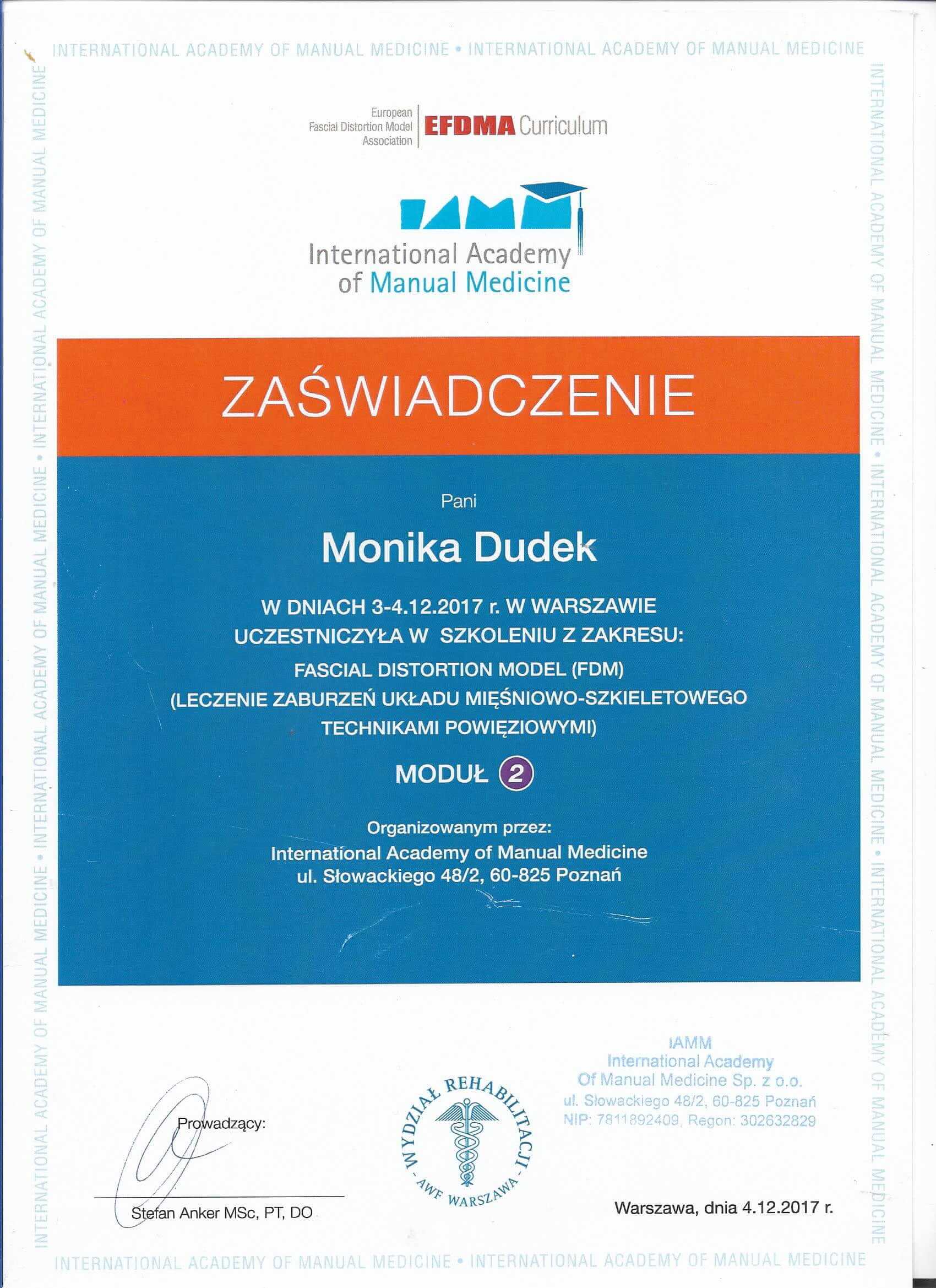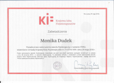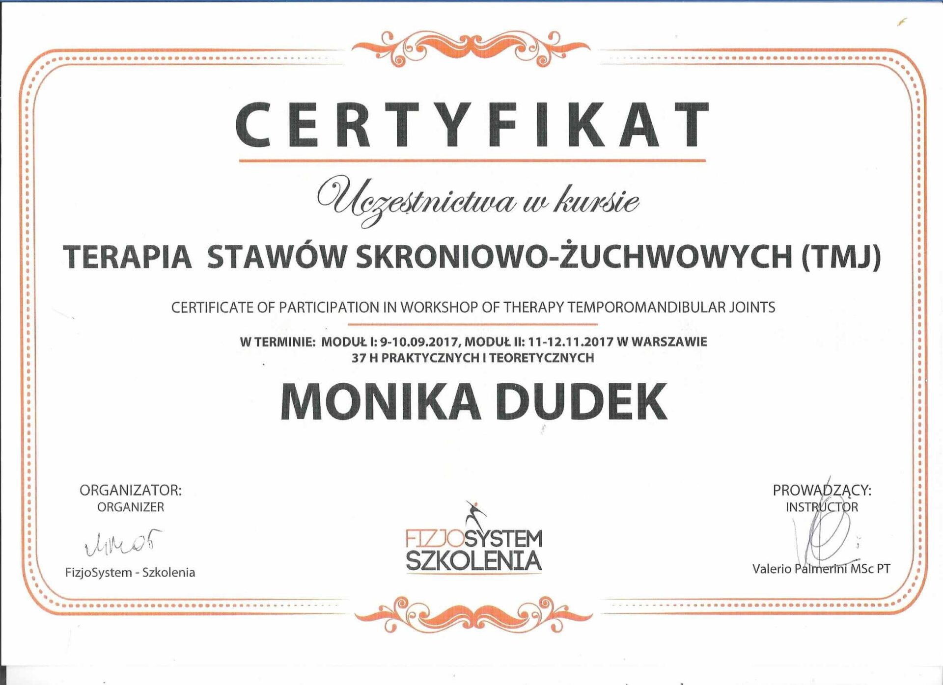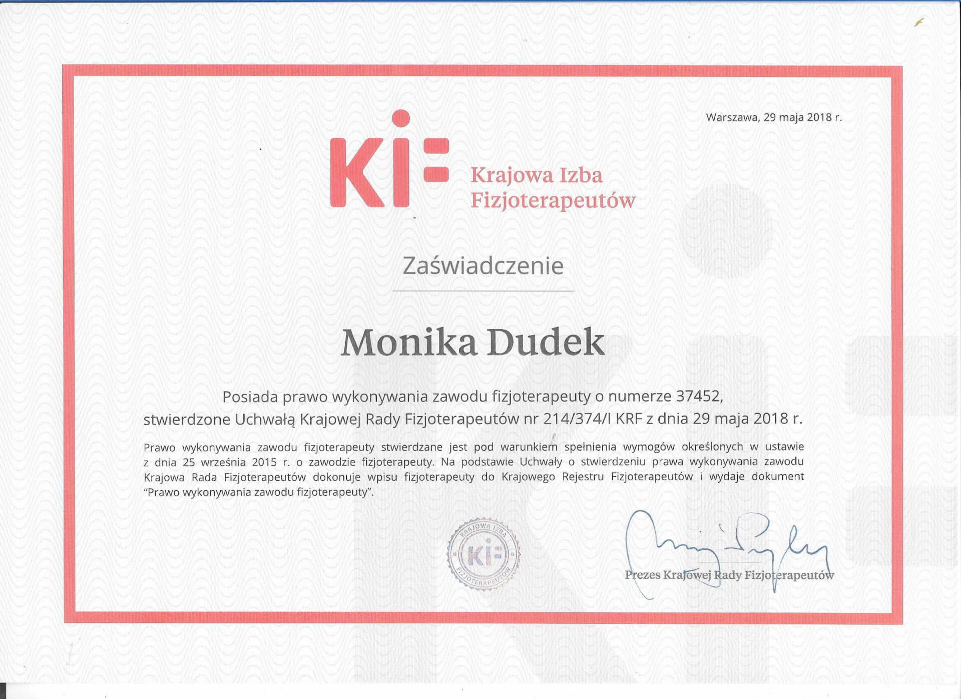 Monika Dudek – magister fizjoterapii, ukończyła AWF w Warszawie w 2000 roku. Pracowała w kilku prywatnych gabinetach, wykładała na WSM w Warszawie. Ukończyła specjalistyczne kursy z zakresu terapii manualnej, powięziowej i wisceralnej, PNF, Mc Kenzie, kinesiotapingu i stawów skroniowo-żuchwowych. Obecnie prowadzi własny gabinet fizjoterapii w CM Scanmed.