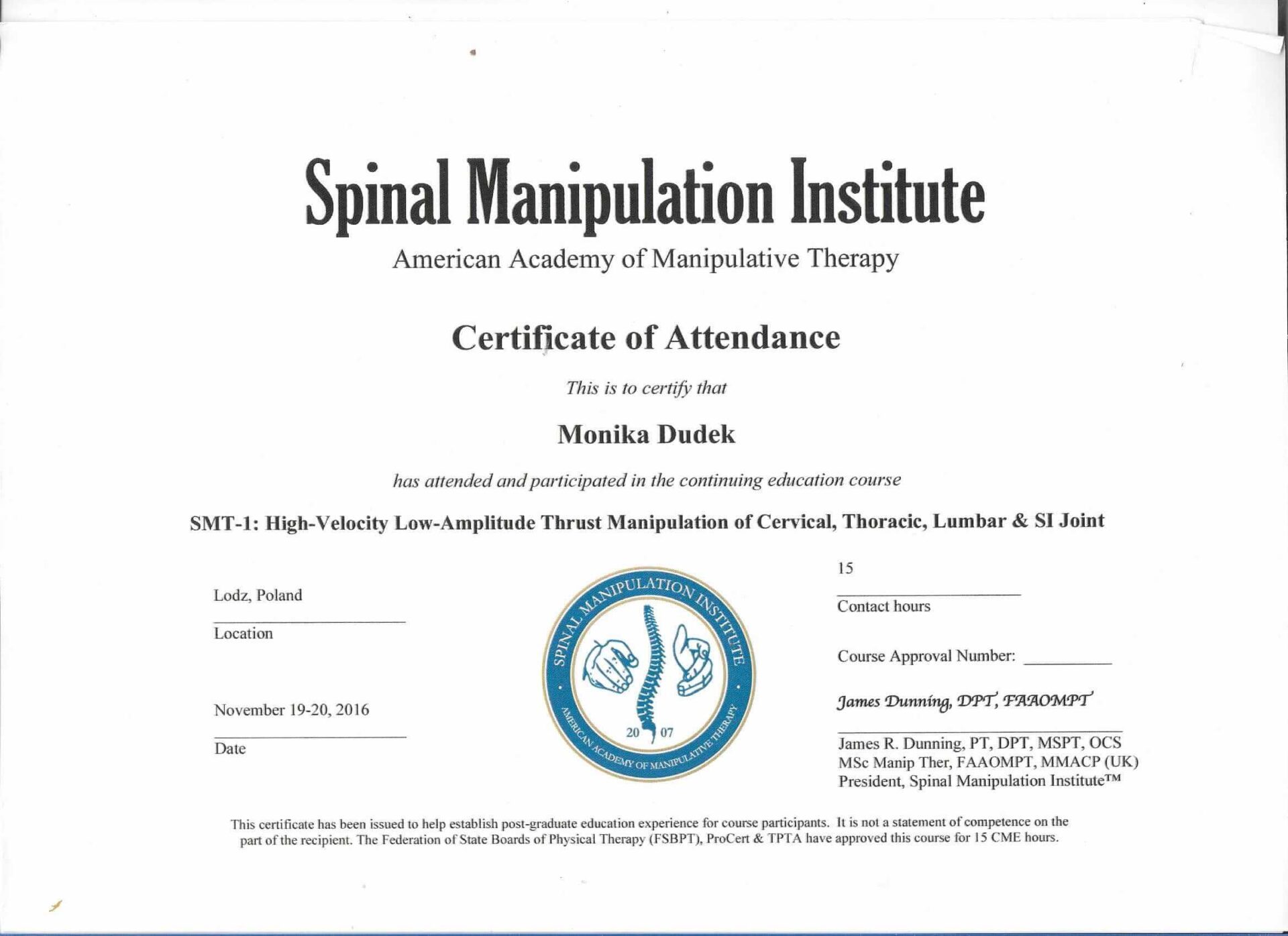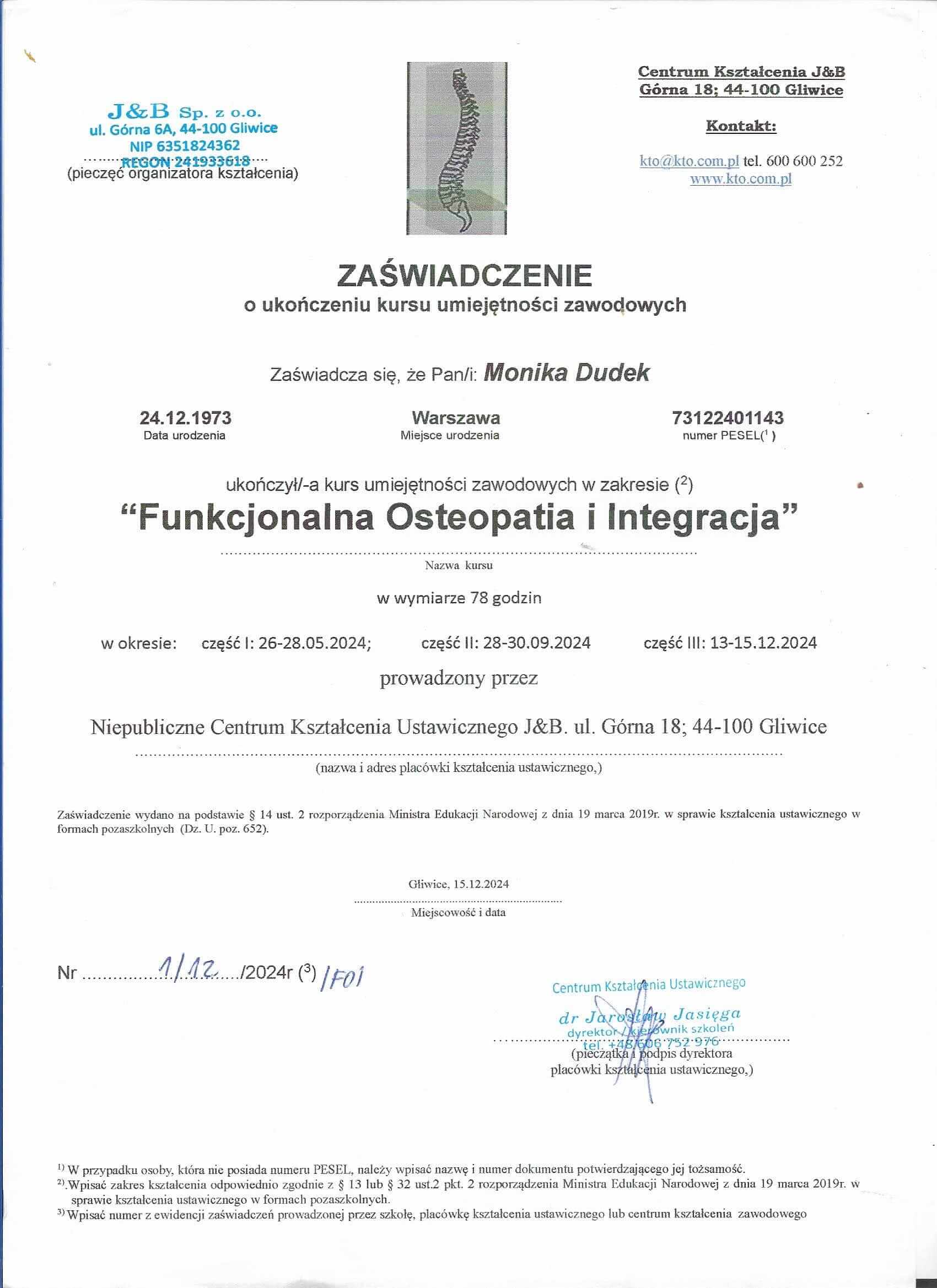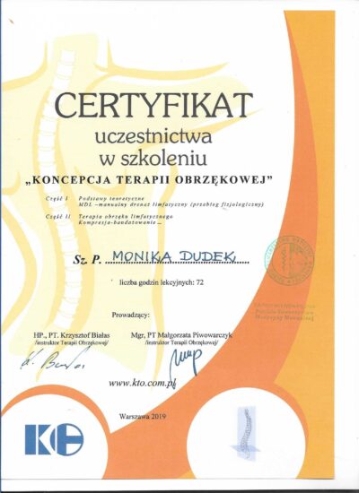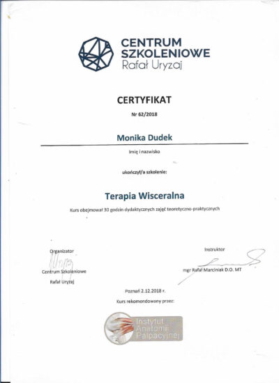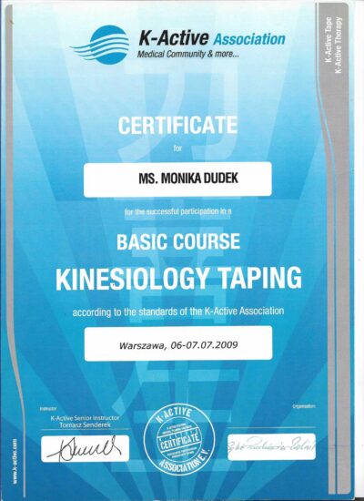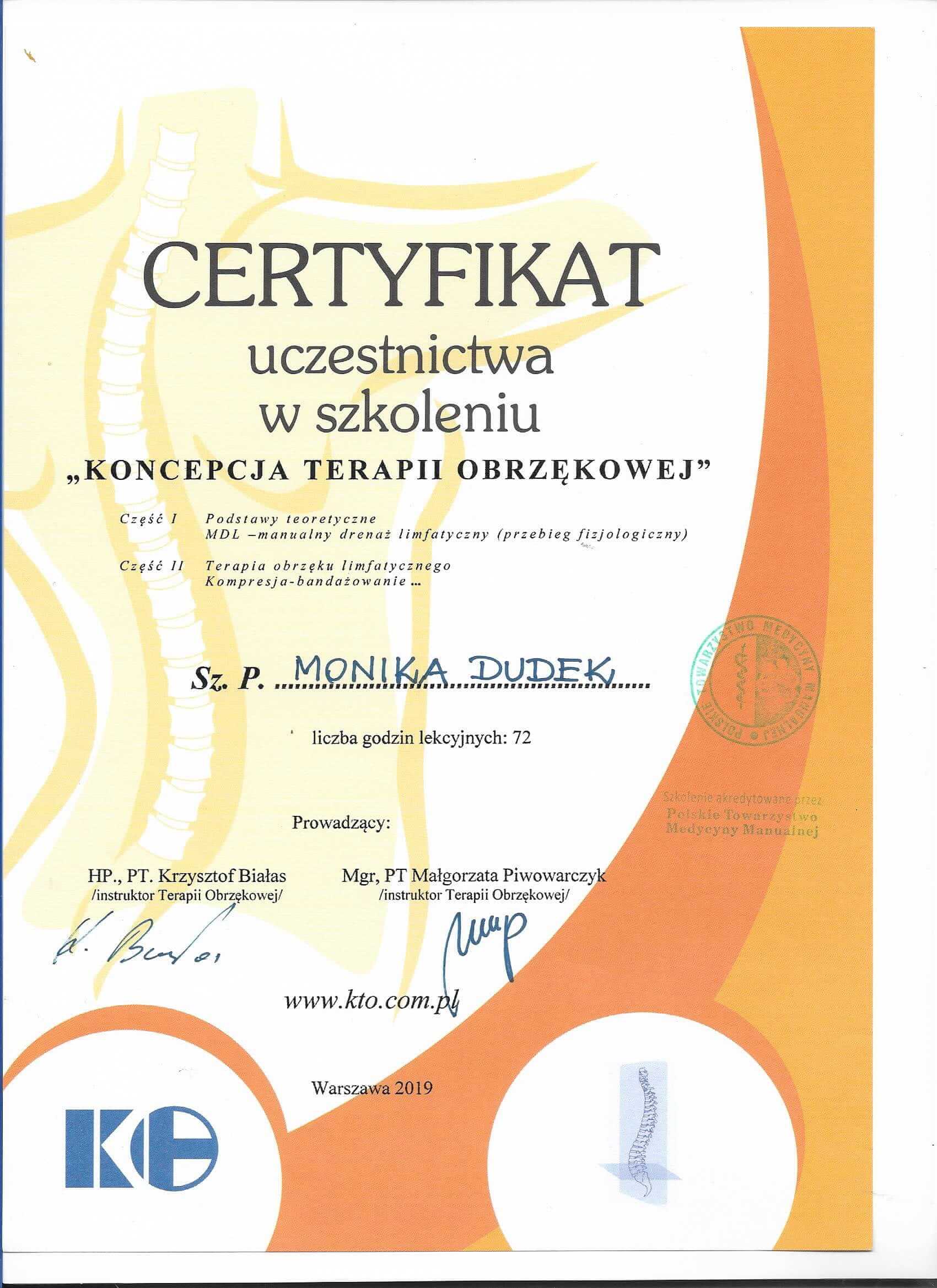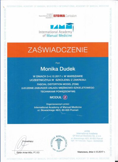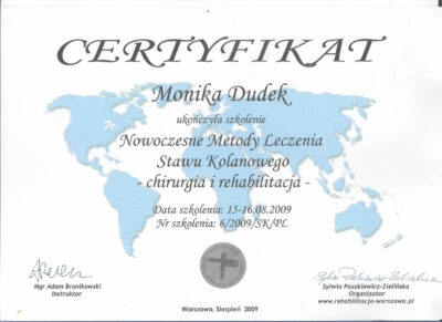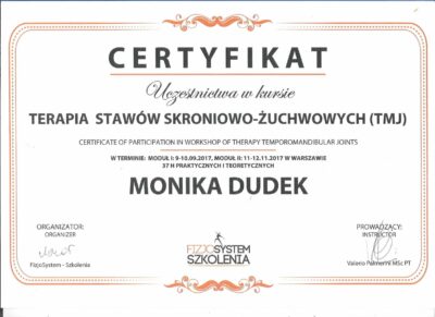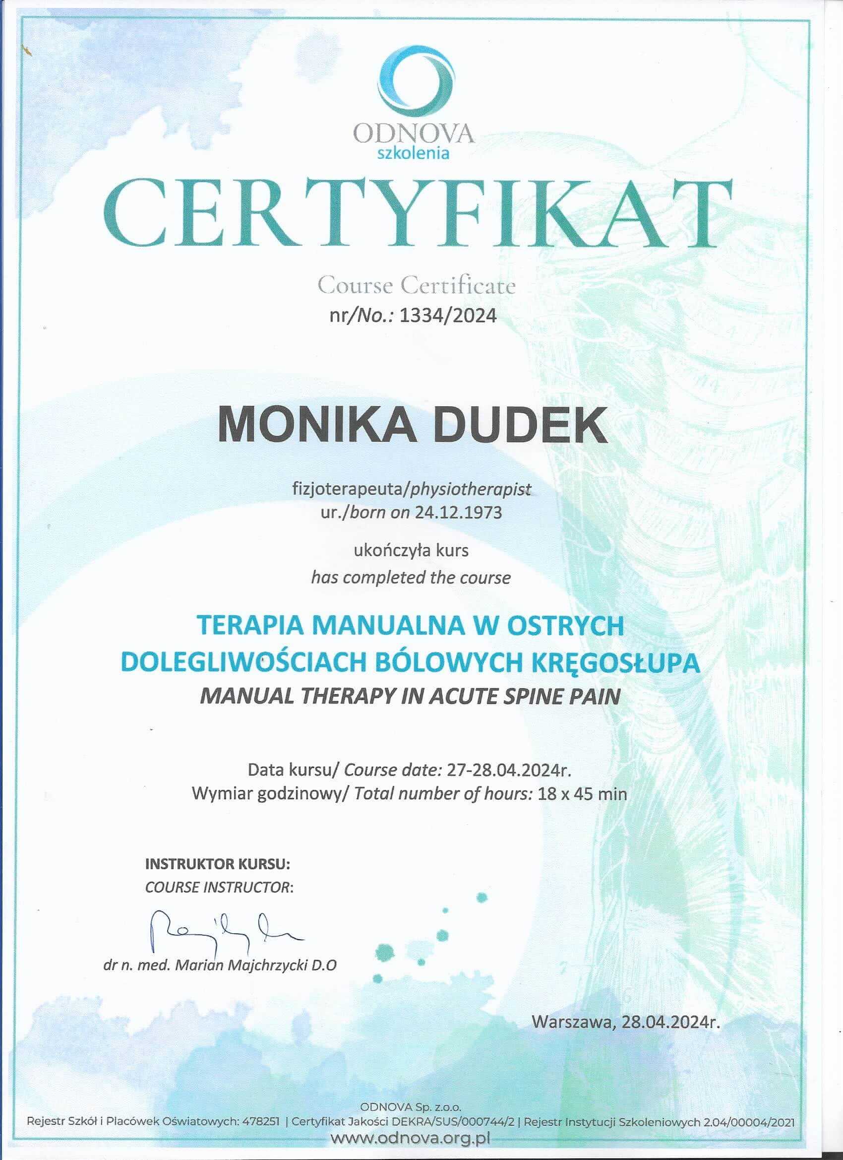 Monika Dudek – magister fizjoterapii, ukończyła AWF w Warszawie w 2000 roku. Pracowała w kilku prywatnych gabinetach, wykładała na WSM w Warszawie. Ukończyła specjalistyczne kursy z zakresu terapii manualnej, powięziowej i wisceralnej, PNF, Mc Kenzie, kinesiotapingu i stawów skroniowo-żuchwowych. Obecnie prowadzi własny gabinet fizjoterapii w CM Scanmed.